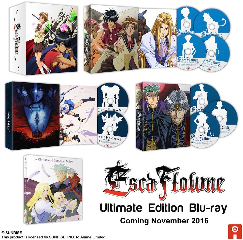 The Ultimate edition of Escaflowne is available for the first time in the UK in High Definition with both English language and Japanese with English subtitle. Contains all 26 episodes restored into beautiful HD, the director s cut versions of select episodes never released before in the UK (Japanese with English subs only), the standalone film, collector s edition packaging and a large hardback artbook.